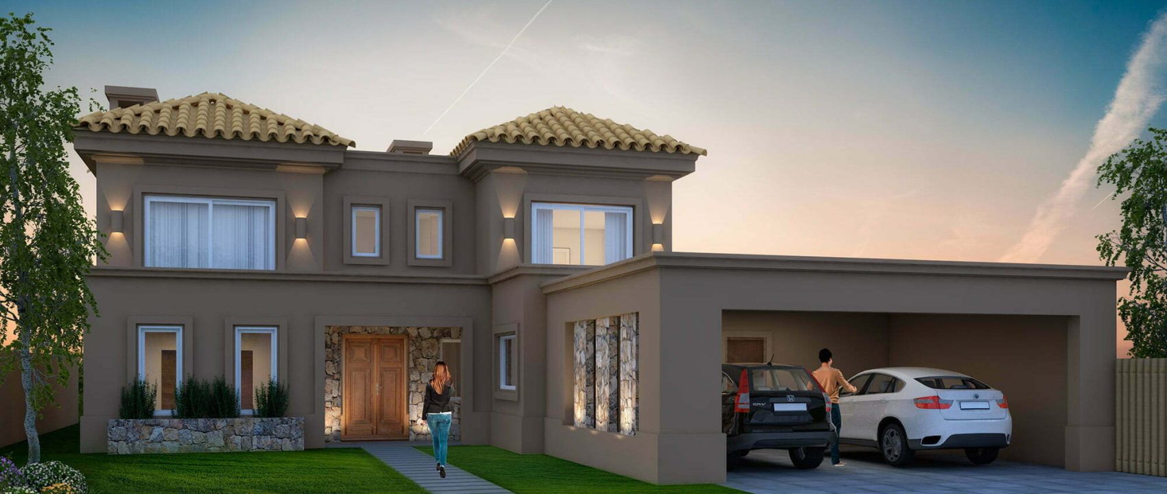 Como elemento primordial se juega con piedra natura, y molduras destacadas e integradas completamente integradas con el revoque texturado colores naturales.