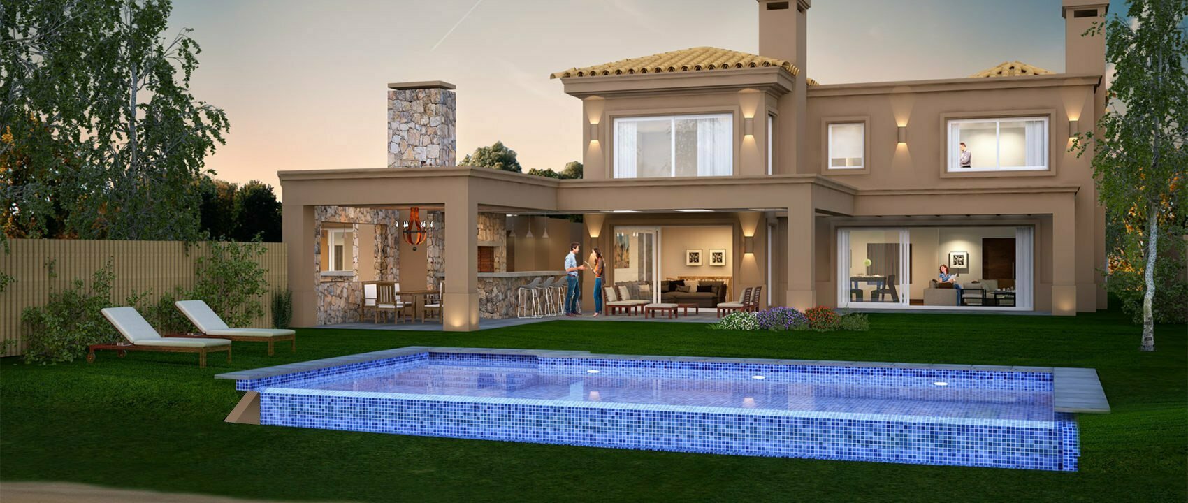 Las áreas sociales como el living – comedor y el estar se abren completamente hacia el lago, con una amplia terraza- parrillero techado como elementeo integrados con el exterior. Un gran espacio de guardado que se integra perfectamente al lago con una piscina con desborde infinito que hace las veces de elemento intermedio.